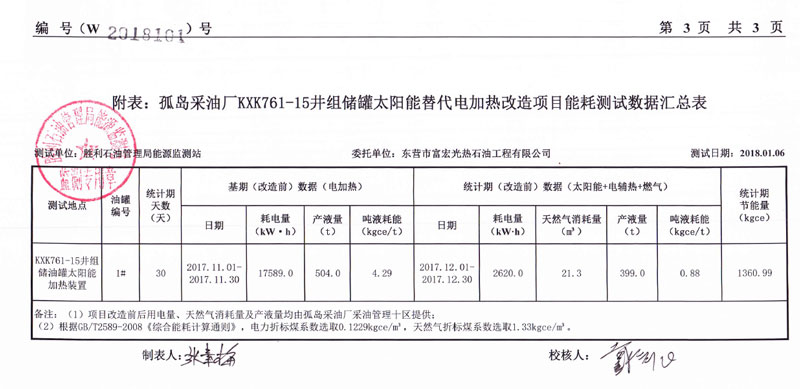 2017年11月20日,對勝利油田孤島采油廠采油管理十區(qū)的KXK761-15井組原油儲罐進(jìn)行光熱自控加熱裝置技術(shù)改造,改造前噸液加熱單耗4.38kgce/t,改造后噸液加熱單耗2.19kgce/t ,節(jié)能率49.9%。
